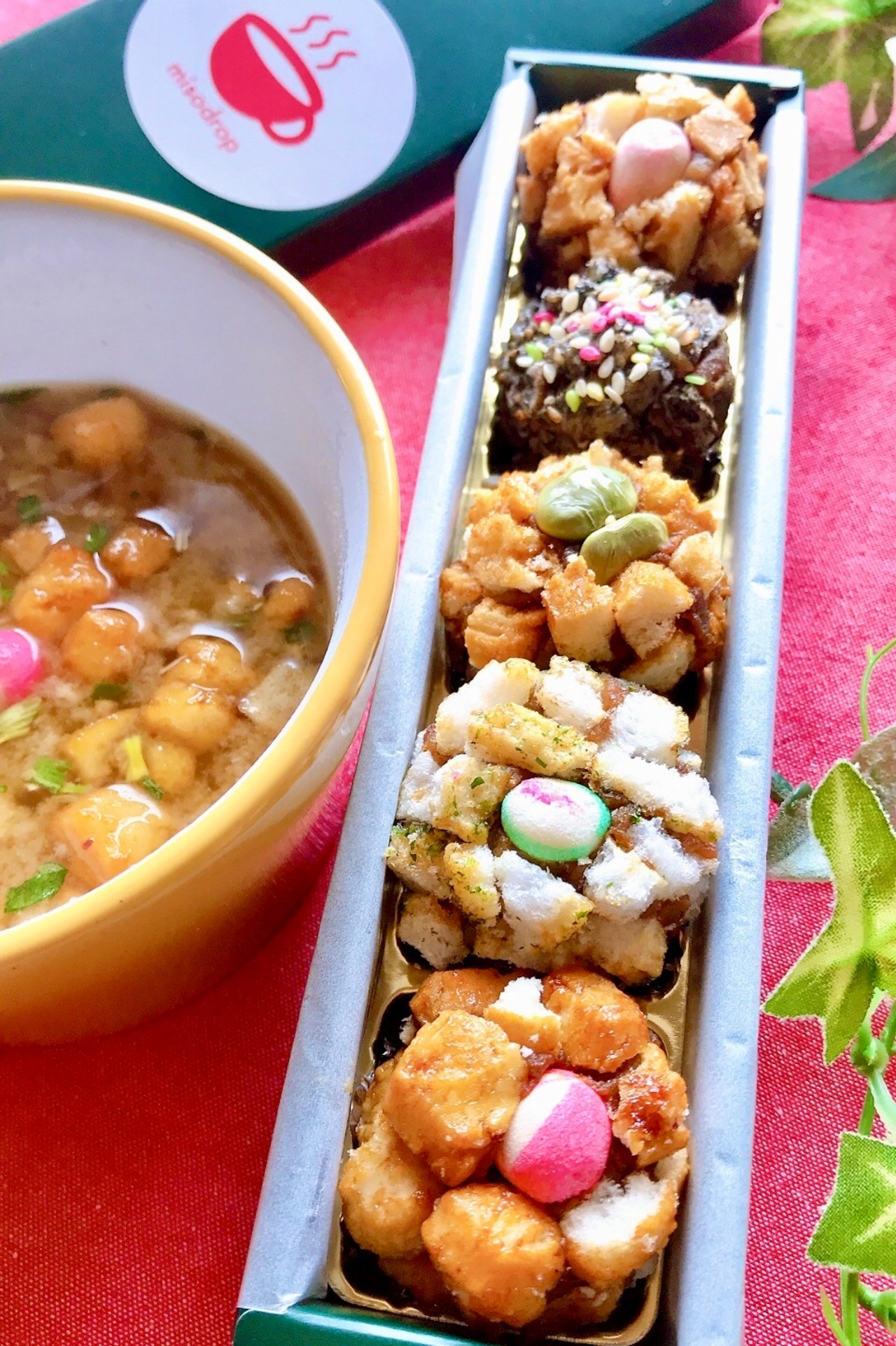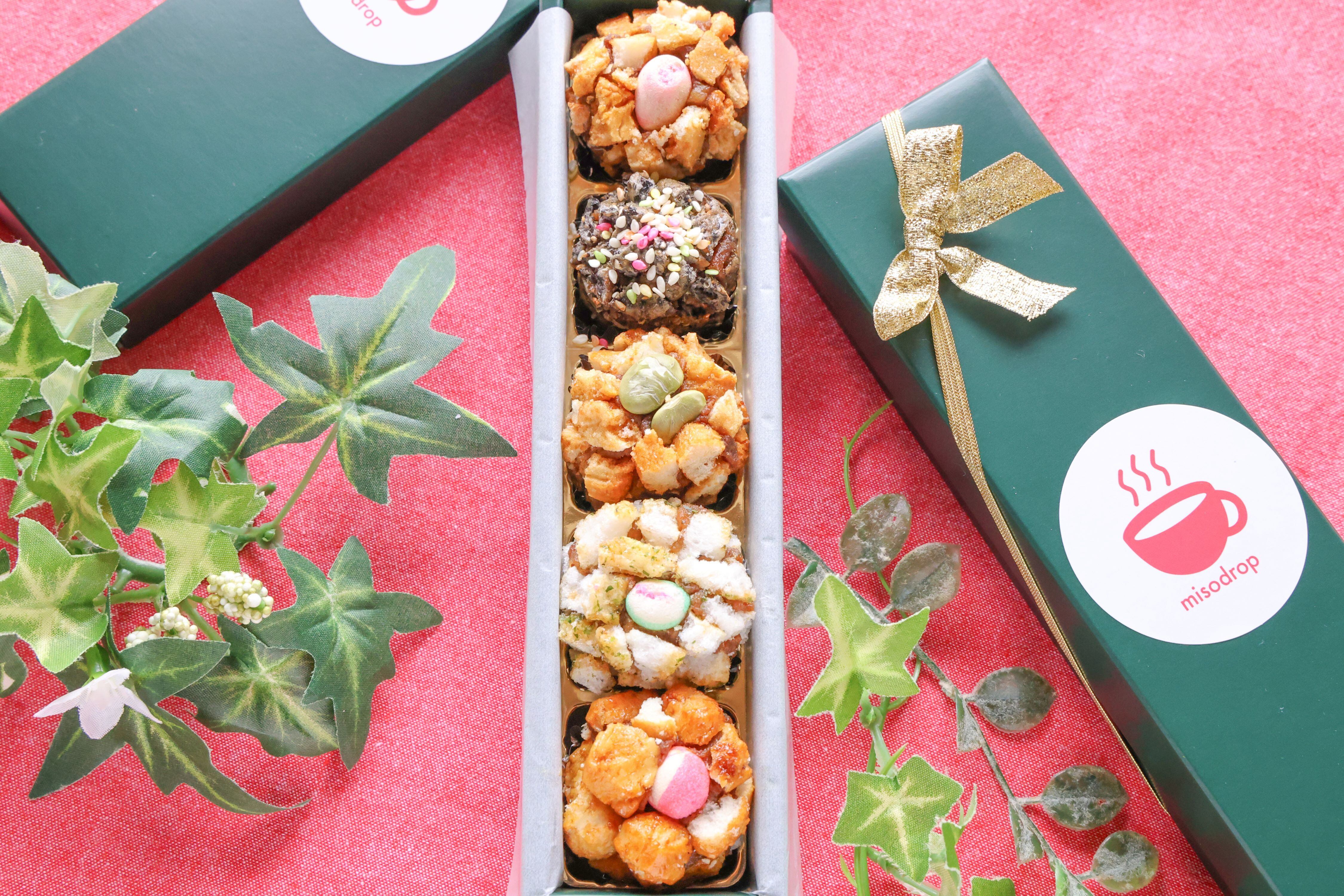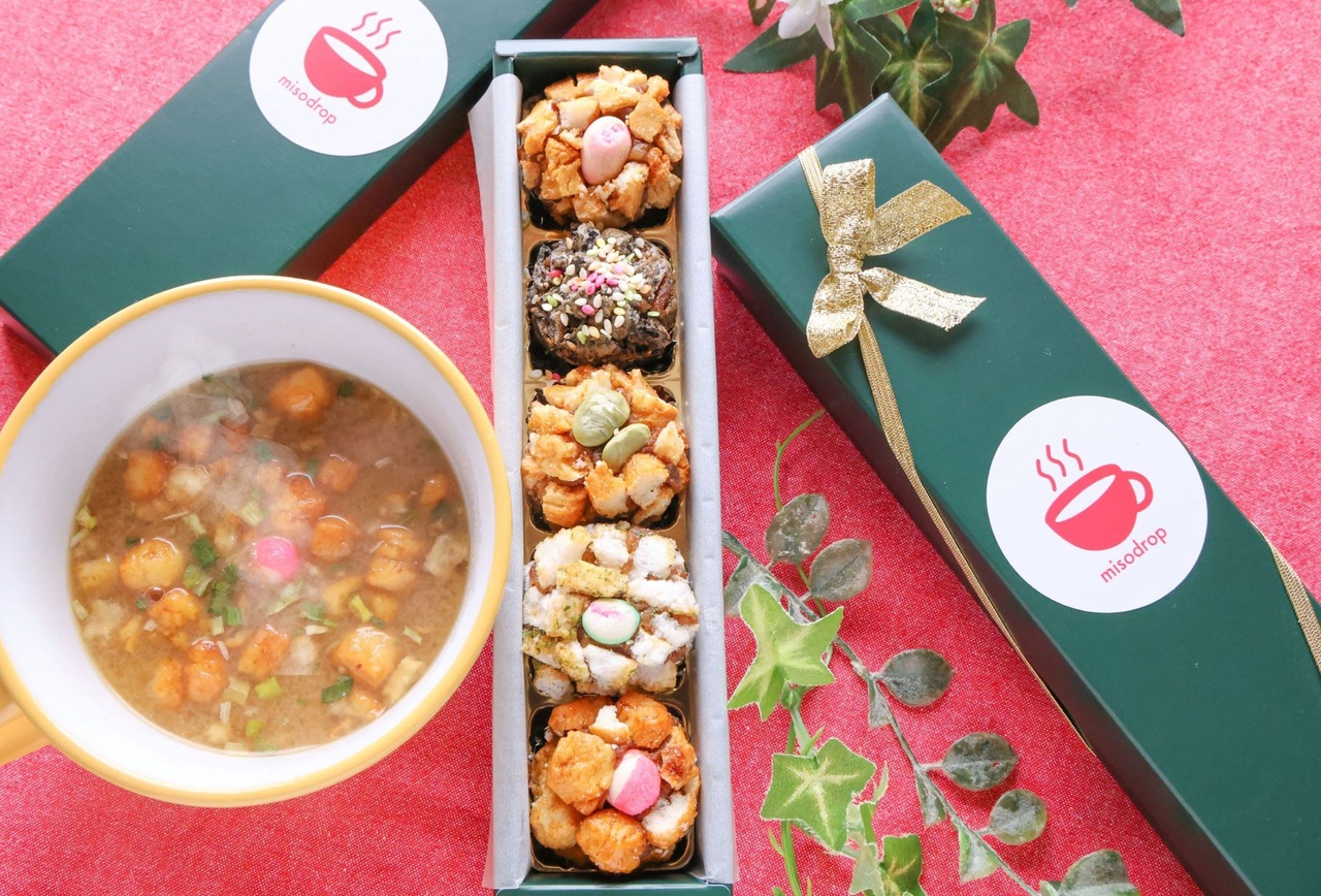 周辺の米菓は、醤油おかき、青のり揚げあられ、黒ゴマおかきです。出汁はmisodropオリジナルの野菜だし。やさしいだしに醤油やゴマ、揚げ油のフレーバーが溶け出して、スープの旨味がぐーんと上がります。